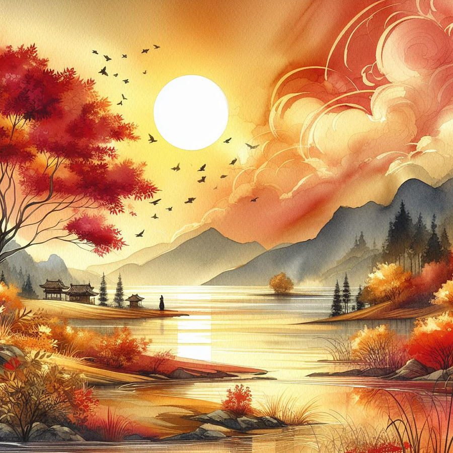 In a world where art meets innovation, where pixels dance to create breathtaking landscapes, there exists a masterpiece that seamlessly blends the serenity of nature with the brilliance of artificial intelligence. Behold, a captivating watercolor portrayal of a majestic mountain and tranquil lake, adorned with hues of red and gold, brought to life by the ingenuity of AI.